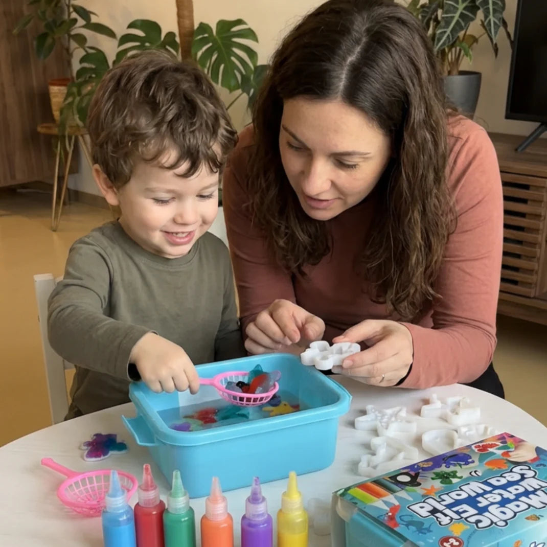 Wecke die Fantasie deines Kindes mit diesem kreativen Set, mit dem Kinder ihre eigene Welt bunter Wasserwesen gestalten, funkelnde Gele mischen und die zauberhaften Veränderungen von Farben und Texturen beobachten können. Das Spiel fördert Kreativität, Feinmotorik, das Erlernen von Farben und Formen sowie Konzentration – und bietet gleichzeitig eine sichere, bildschirmfreie Beschäftigung voller sinnlicher Erlebnisse. Perfekt auch für gemeinsames Spielen, Kooperation und Teilen, was Kommunikation und Teamkreativität stärkt.